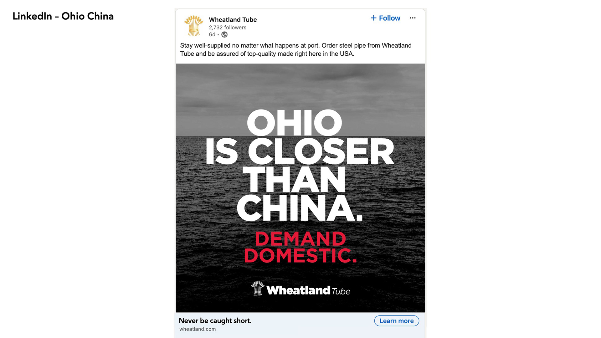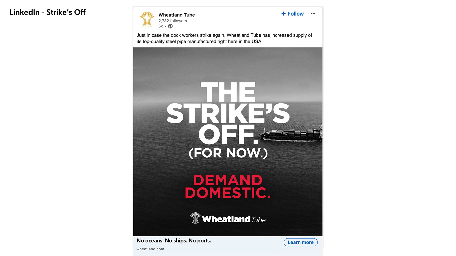 Tuesday, Oct 1, 2024, the Longshoreman’s union went on strike, shutting down every port in America, and making overseas goods impossible to deliver. Wednesday, Oct 2, we had these messages for domestic manufacturer, Wheatland Tube, ready to run.